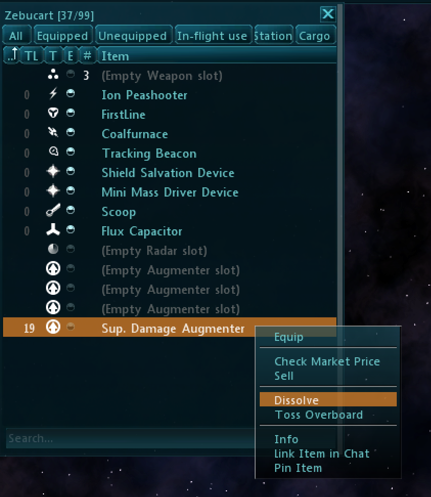 Dilutions are a new type of commodity in Star Sonata obtained by right clicking on an augmenter in your inventory and selecting the option to “Dissolve.”