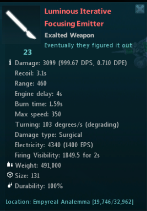 We’ve added a scaling electricity cost to the extra shots on the Deathblossom. This change makes Deathblossom mode much less energy efficient, particularly when firing against only 2 or 3 targets. Additionally, Deathblossom mode now disables your normal “selective firing” mode, meaning you cannot target a planet or moon to get an additional stream of shots on the target. This will encourage players to toggle the Deathblossom on and off based on what they are fighting. We have fixed a longstanding bug preventing Damage mods on Deathblossoms from working and have added these mods to various  Deathblossom items for an added level of complexity. On-hit weapon effects (splash, area of effect, chain, etc.) no longer occur while the Deathblossom is equipped, greatly reducing visual lag and freeing us up to buff weapons with those effects for use by other classes as well. Finally, targets are no longer shot simultaneously, instead they are fired at a fixed rate, which will lead to a significant gain in server and player client performance, especially in larger engagements.
