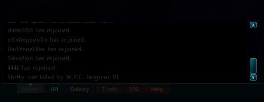 The event channel lists all the current activities going on around in the game. This can be from killing AI to show experience gain, players joining, warping between sectors, showing global event bonuses and many other things.