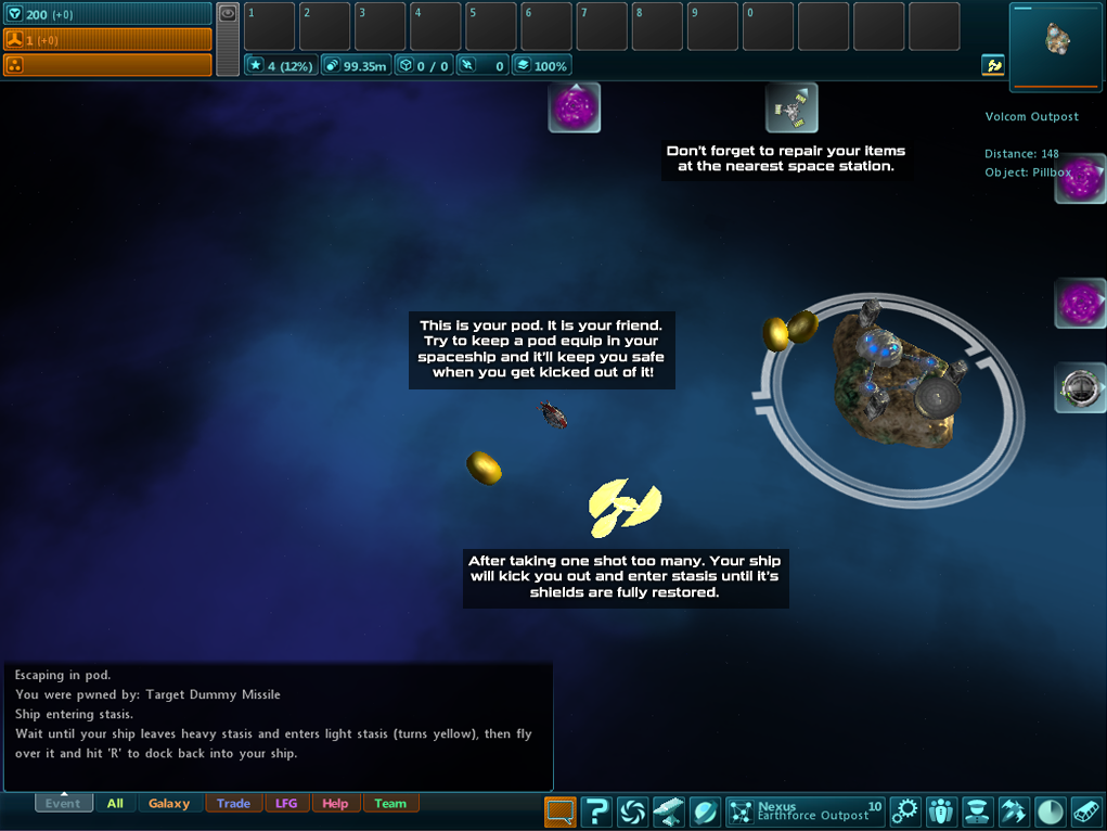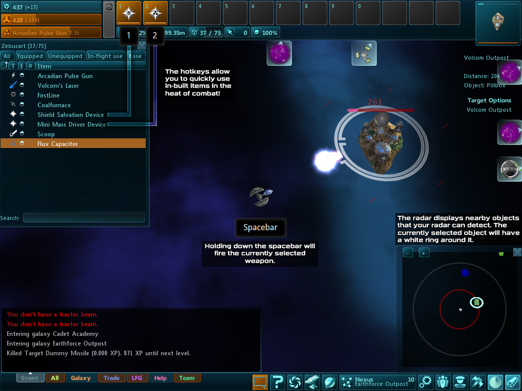 There comes a time in every pilot's life when he asks that all-important question. You have his Earth Force type 1 pilot license, knows how to fly his ship without faceplanting into the nearest asteroid, and finally ready to take space by the horns and blow stuff up for the hell of it. Now what? Glad you asked, recruit! See your standard-issue Zebucart? We don't just fit these things with cheese-graters these days. Take a look. Pressing Space will fire your weapon at whatever low-life you happen to be locked onto. Just like that failed cadet. Proving your superiority is an important part of every-day life in wild wastes of the galaxy, not just while you're recieving training here in the Academy! That's right; Space is not a very nice place, and everything almost has a gun. If you pick a fight, they're going to shoot you back and it's probably going to hurt. Sitting there and letting your enemies spray pain in your general direction is a surefire way to turn your lovely new ship into a quivering mass of stasis. Know your ship and your guns, learn to lead enemies into your shots and use your maneuverability to dodge incoming fire!When You Die...