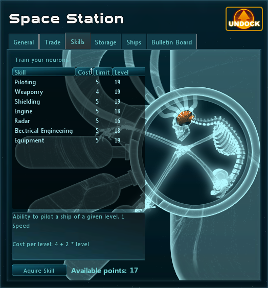 What's that? You heard Raucus cheering as you slaughtered that last enemy? That means you've gained sufficient experience to level up! For each level you gain, you will acquire 5 skill points to be allocated as you desire in most space stations. The skill training interface looks a little like this: