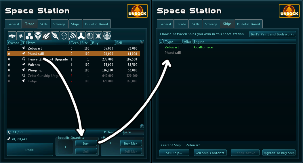 While our standard-issue Zebucart ships are laden with the latest technology, the Academy understands that the more daring-blooded pilots will seek out bigger and better ships. This can be done from the Trade tab at many space stations; Assuming you followed my previous recommendation of improving your skills, of course.