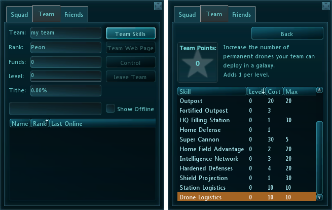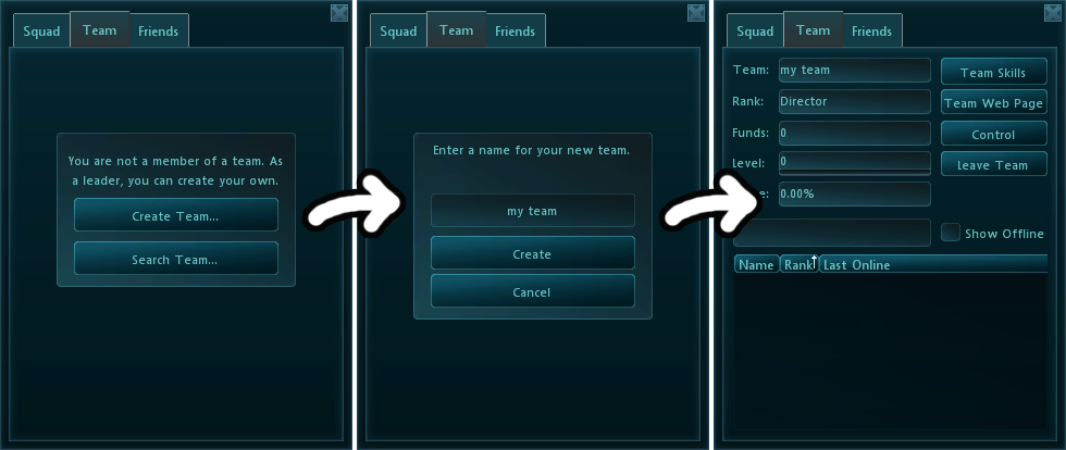 First open the Team window by either pressing the F8 key or clicking the Social button located down the bottom right and selecting the "Team" tab. Click the "Create Team..." button, type in your team name into the textbox (once this is set it cannot be renamed). You will require to have Leadership 1+ skill to be able to create a team.