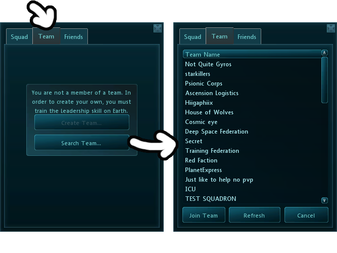 Then click the "Search Team" button to bring up available teams that are recruiting. Once you've decided what team to join click the teams name in the list and click the "Join" button.