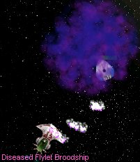 The Diseased Flylet Broodship is a larger and stronger version of the puny diseased flylet, and is immune to all damage with the exception of surgical. It is known to drop rare and valuable low-tech equipment; chief among these are Mzungu Invertoblasts and its special Flylet Broodmother Augmenter. It is level 3, and can be killed by two shots or less of any un-augmented ship using a surgical laser, leading it to be heavily camped. Was a boss in C1. No longer exists.