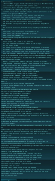 /Alternativettle - Toggles the alternative title bar (concept by the white wizard). rap <Galaxy Name> - Engage autopilot to specified galaxy. /avoid <Galaxy Name> - Makes the autopilot avoid the specified galaxy (toggled). Can also be done by Shift+Right Click on galaxy map. /avoidteam <Galaxy Name> - Makes the autopilot avoid any galaxy owned by the same team as the galaxy specified (toggled). /chatcolor <r> <g> [r] [g] - Change the color of the chat frame. /CLKL <value> - Set a minimum value to the lag killer for logicfps. /CLKU <value> - Set a maximum value to the lag killer logicfps. /CP - Clear the profiler data. (will enable the profiler if disabled) /DP - Dump the current profiling data to the logs. (will enable the profiler if disabled) /FR - Do a quick reconnection, essentially forcing everything to reload from the server. /GLKL <value> - Set a minimum value to the lag killer for fps. /GLKU <value> - Set a maximum value to the lag killer fps. /help - Display chat command help. ThideHuiMethod - Change the behavior of 'h' from a deadman switch to a toggle for the ui rendering. /ignore <player> - Add a player to your ignore list. /like <team teamname I playername> - remove all hate to target. /list - List ignored players. /LKC [value] - Finetune lagkiller value. use /LKC without params for more info /LKL <value> - Set a minimum value to the lag killer for both logic and render. /LKU <value> - Set a maximum value to the lag killer for both logic and render. /Play - Play a recorded stream of everything happening on the client specify a number as second parameter to fast forward to that offset (in millisecond). Middle click to stop, left click to fastforward to lOsec ago, Right click to fast forward S seconds (double right click for 2 minutes) /Record - Record a playable stream of everything happening on the client. /SaveCommands - Allow player to define a set of /commands to be executed on client start (only commands that do not require a server connection work). /say [text] - Send a message to the focused channel. /search <galaxy> - Center the universe map on a galaxy. rtoggleautocomplete - Toggle automatic mission completion. itoggleitemsetchsplay - Toggles item set tooltip display. /unignore <player> - Remove a player from your ignore list. /whisper <player> <message> - Send a private message to a player. /achievements : Checks if you've completed any achievements and rewards you with them if so /age :Check the age of your character, and online time. /autotractor :Toggle whether or not your tractor will automatically grab something if you don't have a target /basecheck :list bases that'd be affected if you left the team /baseslots :Display number of base slots available /caps :list the ship types that you have captured /charging :Display your current charging rates. /claimkey :Open an interface to enter keycode. /droneslots :Display number of drone slots available /endwar teamname or playername :End the war on said team or soul. can also use /endwar player playername or /endwar team teamname. /enemies :list your personal and team enemies. /events :Provides a detail rundown of currently active events /freeaugreset :Does a free augmenter reset for a ship, if available. /hidemodstar : allows chat mods to hide their star /lfgtimer : Display how much time is left before you can post in lfg chat again. /limbo you may reset the base where your ships are docked at once within the first 24 hours of the universe /lockout /lockouts :Display your current lockouts. /marketcheck /mc itemname : Search an item on the marketplace (publicly accessible userbases and ai bases) /maxturn N and /maxacc N :Set the maximum turn rate I acceleration for your current ship. inetworkfactor /nf value : change the network factor for your account. This will reduce the network load at the cost of more network delays (from Ito 20 default:I) /outfithull : Add built-in items to your hull that were added to the game after you bought your ship /resetbot /resetbots:Reset all bot orders in your gal. /resetsquaddamage Resets the saved damage of your squad members /roll N :Roll a random number from 0 to N, for everyone in the gal chat to see. /shipvalue Display your ship equiped and repairable item total value. /showdamage /showslavedamage /showbasedamage /showdronedamage :Show damage done by the respective source. /showdeltacreds :Show a message whenever you gain or lose credits. /showpain :Show the damage done to you. /showscoop :Show scoop related message (squad and event chat). /showsquaddamage Shows damage done by all your squad members /showtrade :Show any trades related to you in your current galaxy. /squadboot playername :Boot playername from your squad. /squadcreate : Create a squad with you as leader. /squadinvite /squad playername :Invite playername to your squad. /squadleave :Leave your squad. /teamslots :Display number of team account slots available /tradetimer : Display how much time is left before you can post in trade chat again. /war teamname or playername :War said team or soul. can also use iwar player playername or /war team teamname. /wars :List your team wars.